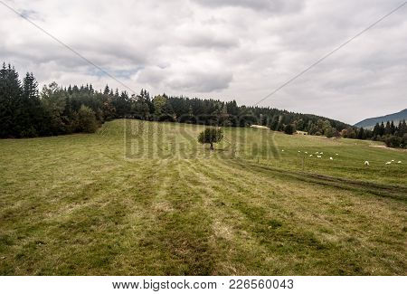 meadow with isolated tree, pathway, sheep and forest on the background in Moravskoslezske Beskydy mountains in Czech republic