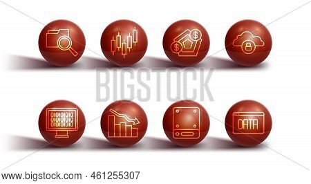Set line Search with folder, Binary code, Cloud computing lock, Server, Financial growth decrease, Browser stocks market, Data analysis and icon. Vector