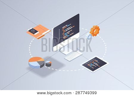 software web site design development concept programming language program code big data processing on computer screen 3d isometric coding technologies flat horizontal vector illustration
