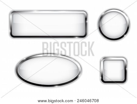 White metallic buttons with different shapes, circle, rectangle, square, oval. Glossy web elements. Vector