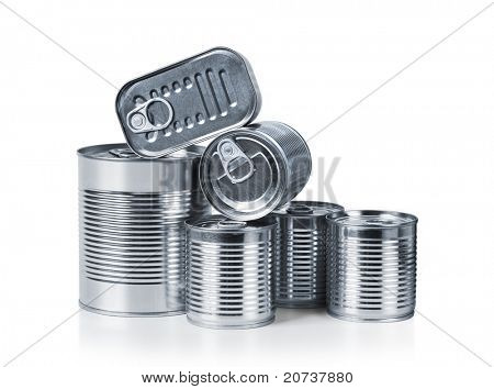 Pile of cans of conserved food over white background