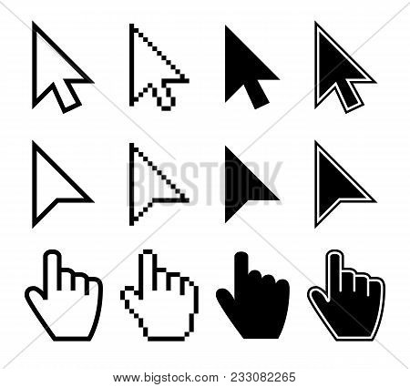 Clicking mouse cursors, computer finger pointers vector set. Mouse pointer finger, cursor arrow hand illustration