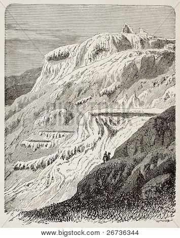 Antique illustration of petrified waterfalls of Hierapolis, nowadays Pamukkale, Turkey. Created by Hubel, published on L'Eau, by G. Tissandier, Hachette, Paris, 1873.