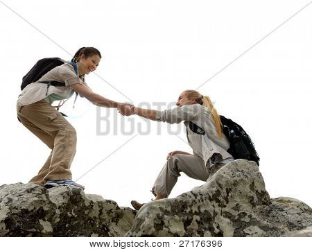 Hiker woman helps her friend climb up the last section of mountain. teamwork in outdoor lifestyle adventure