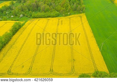 Spring in the Sudetes Foothills. Undulating, undulating, uneven terrain that is part of the Kaczawskie Mountains. The area of ​​agricultural crops, there are plantations of cereals and rape. It is spring, the flowering season of rape, you can see the yell