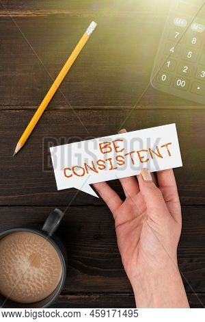 Text caption presenting Be Consistent. Internet Concept Uniform Persistent Firm Unalterable Even Unchanging Rapport Man With Tablet Displaying Power Button And Digital Learning Ideas.