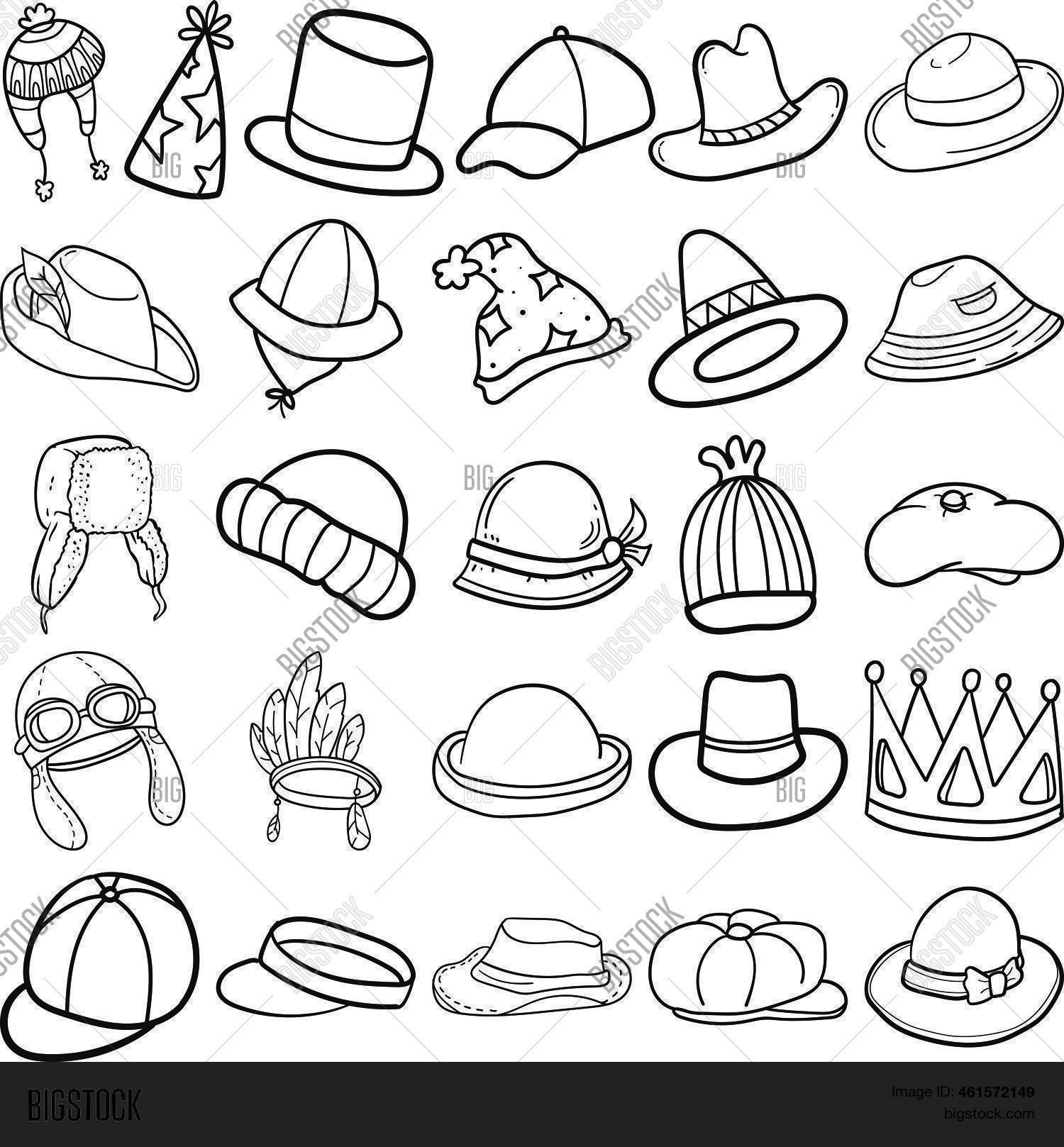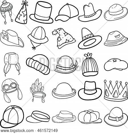 Hats Hand Drawn Doodle Line Art Outline Set Containing Hat, Cap, Fedora, Trilby, Panama Hat, Bowler, Snapback, Dad Hat, Newsboy, Flat Cap, Beanie, Bucket Hat, Baseball Cap, Trapper Hat, Boater, Pork Pie, Top Hat, Visor, Party hat, Crown, Cloche, Beret, F