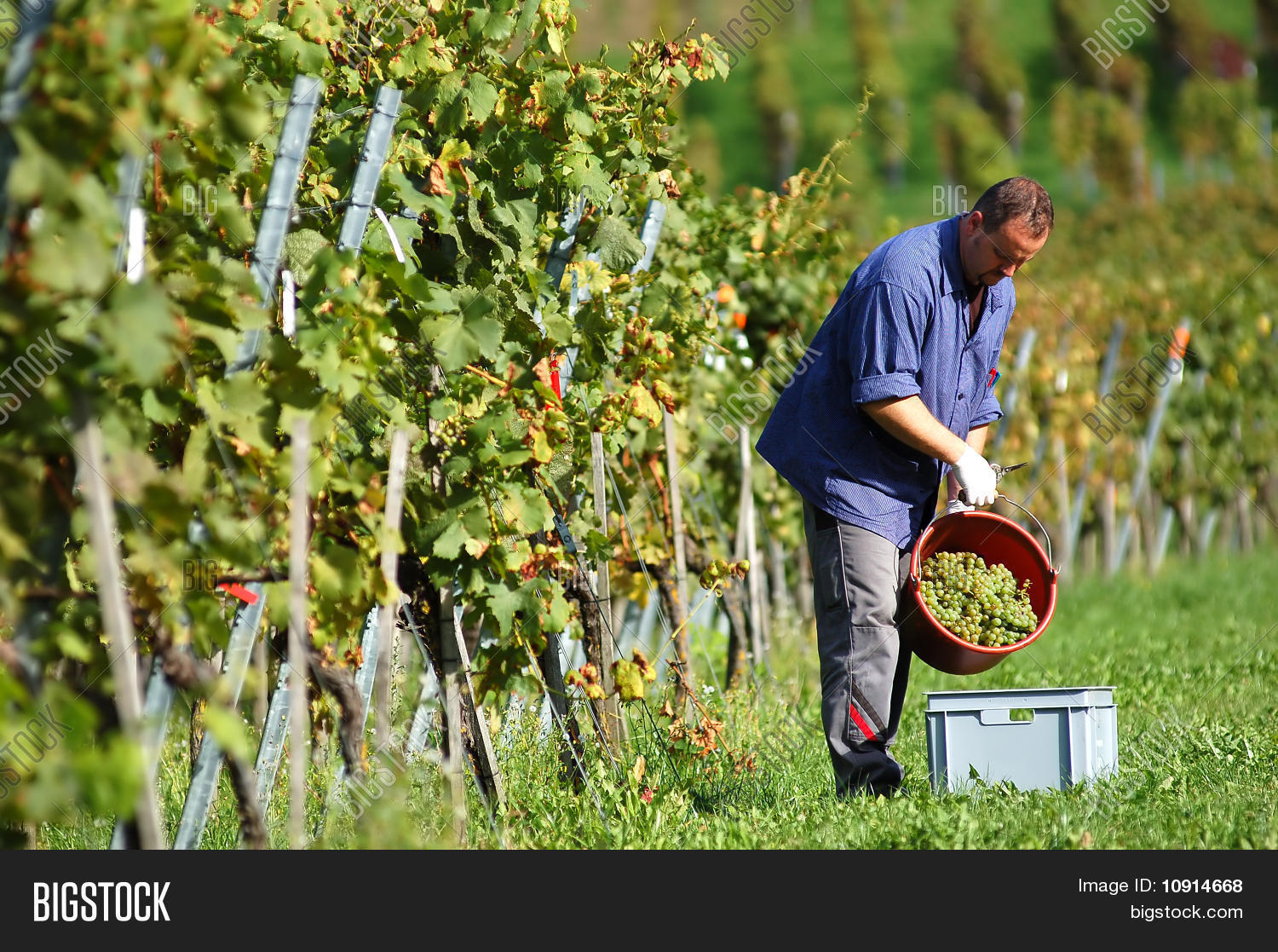 Young vintner is harvesting white grape in the vineyard by sunny weather