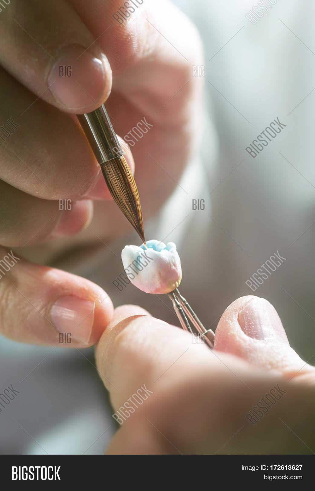 Dental prosthesis artificial tooth prosthetic hands working on the denture false teeth.