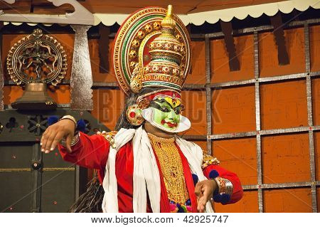 FORT COCHIN KERALA SOUTH INDIA MARCH 06: Cochin Kerala South India March 06 2011. Kathakali performer in the virtuous pachcha (green) role in Cochin Kathakali Center. Kathakali is the ancient classical dance form of Kerala.