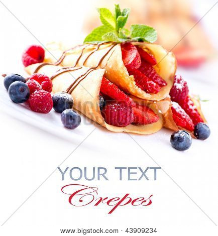 Crepes With Berries. Crepe with Strawberry, Raspberry, Blueberry and Chocolate topping. Pancake