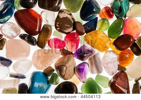 Assortment of polished semi-precious gem stones shot in the studio against white background.