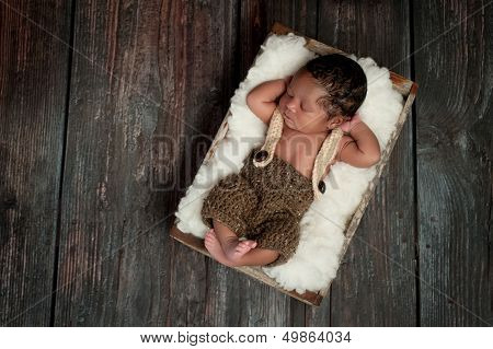 Overhead shot of a 5 day old newborn baby boy wearing crocheted shorts and suspenders. He is sleeping in an old vintage wood crate. Shot in the studio on a rustic barn wood background.