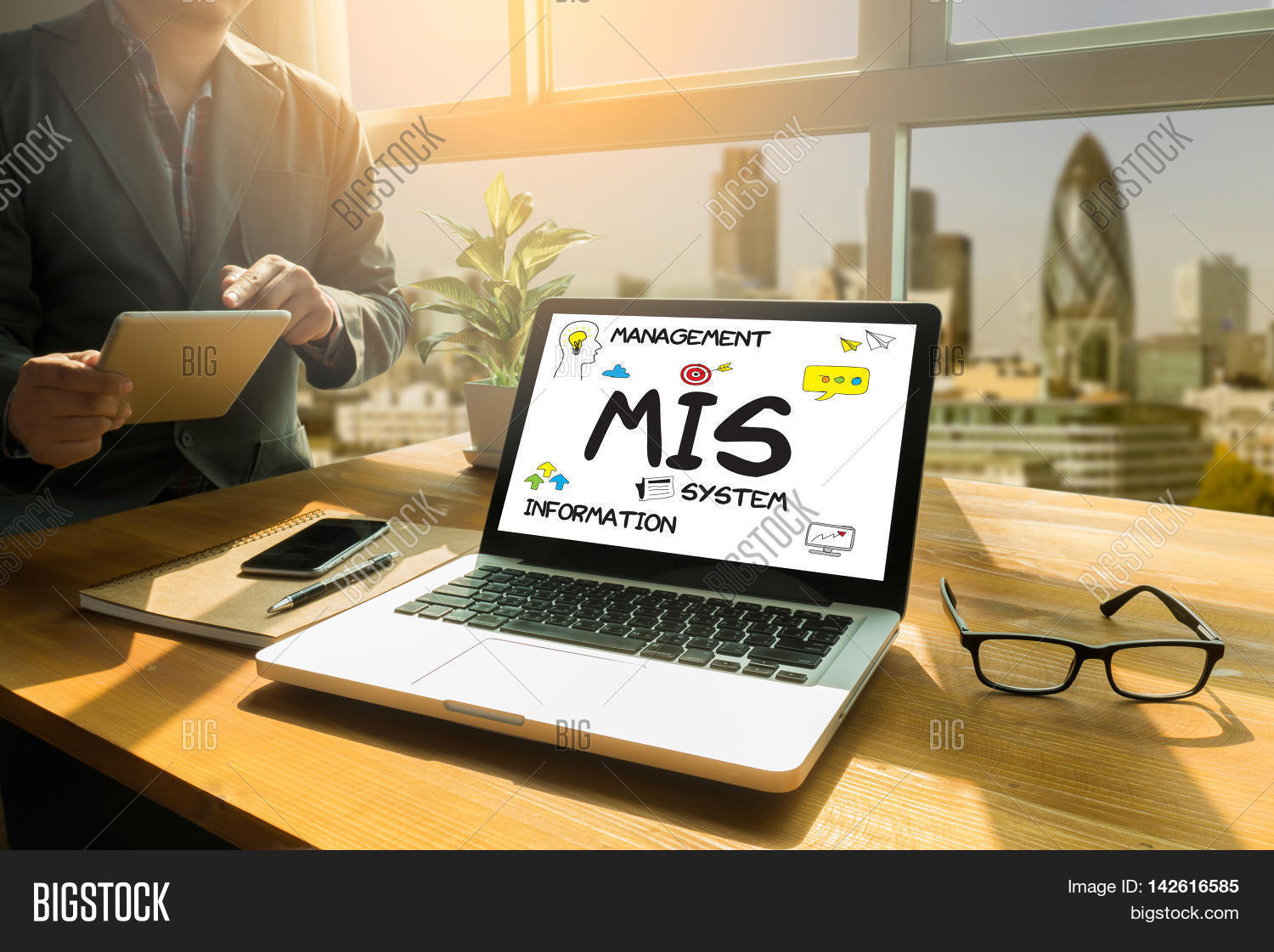 MIS Management Information System Data Development Information and MIS Thoughtful male person looking to the digital tablet screen laptop screenSilhouette and filter sun