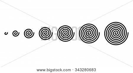 Development of linear spirals of different sizes. Archimedean spirals of black color, with turnings of one arm of an arithmetic spiral, rotating with constant angular velocity. Illustration. Vector.