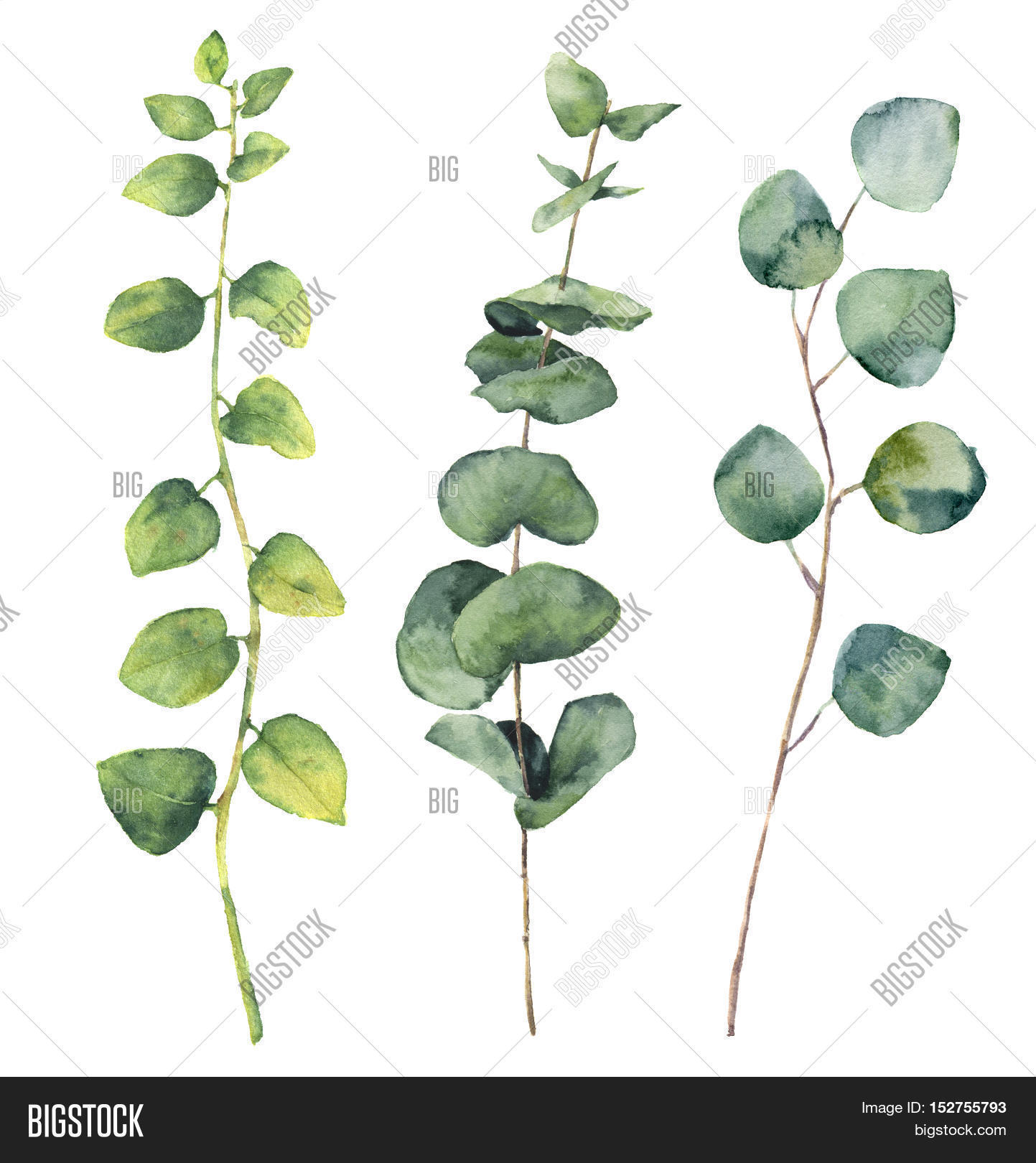 Watercolor eucalyptus round leaves and twig branches. Hand painted baby and silver dollar eucalyptus, twig herb elements. Floral illustration isolated on white background. For design, textile and background