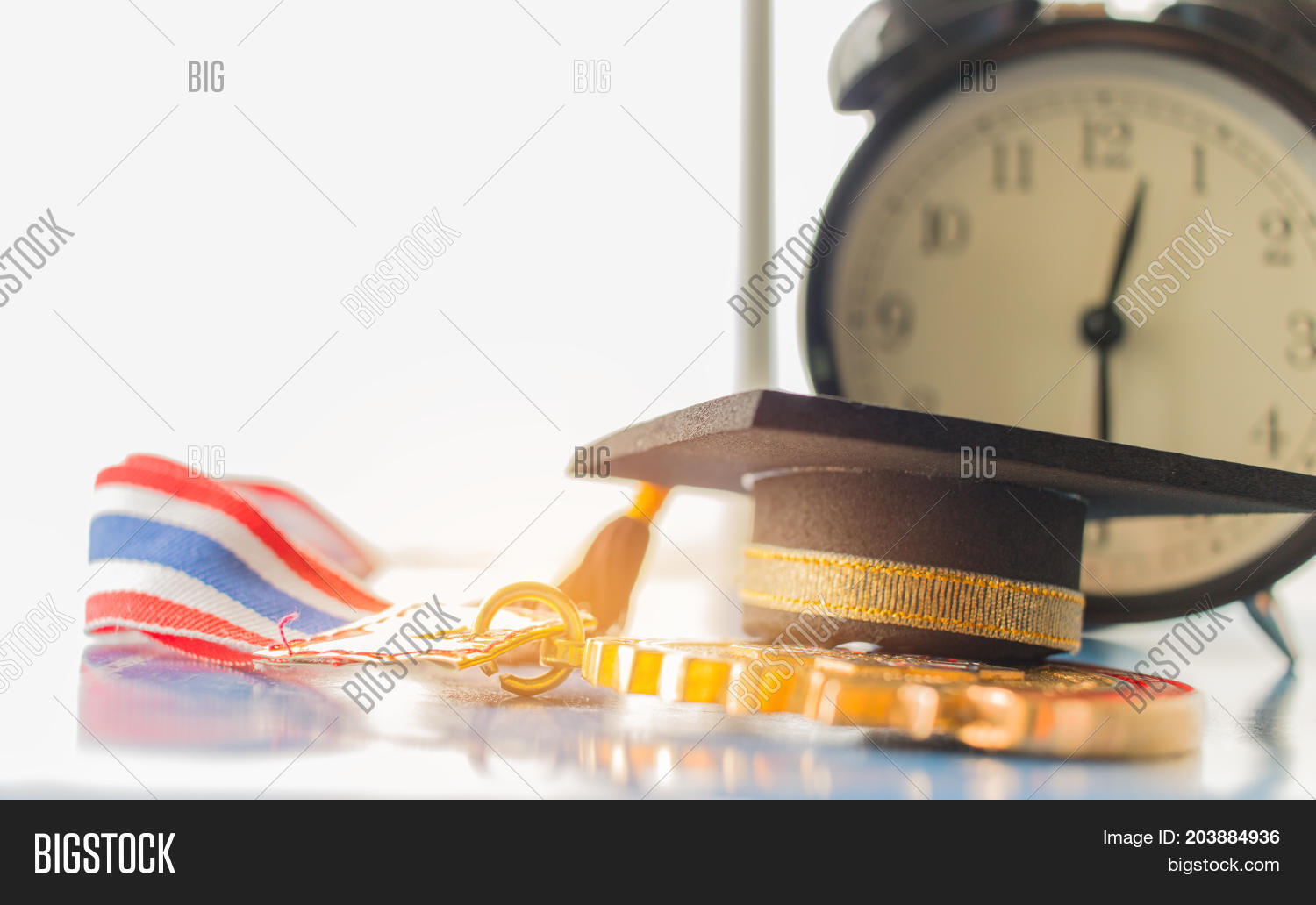 Graduation cap on Golden medals with clock graduate education in university Competitions and Educational study concepts. Success in study famous institution Concept of winner abroad international.