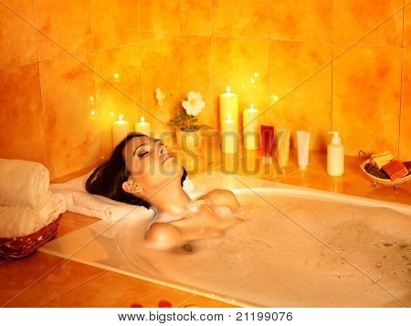 Young woman take bubble bath.
