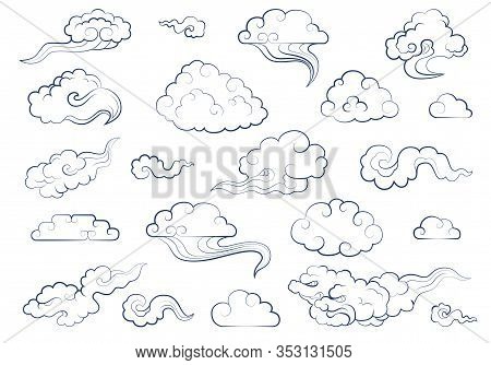 Clouds in traditional Chinese style. Big set of weather elements clouds, fog, cloudlet, wind