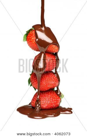 Pouring melted chocolate over four strawberries over white