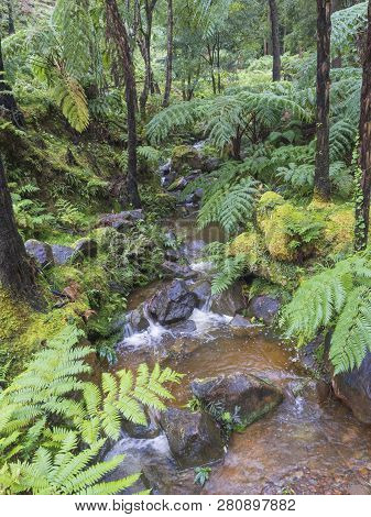 Natural spa with hot thermal water spring, creek cascade with lush tree ferm, moss and stones in caldeira velha, San Miguel, Azores islands