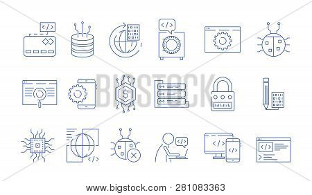 Coder icons. Programmer computer software expert input ends execute cluster bugs fix testing systems java code vector symbols. Illustration of software programmer, system programming and coding