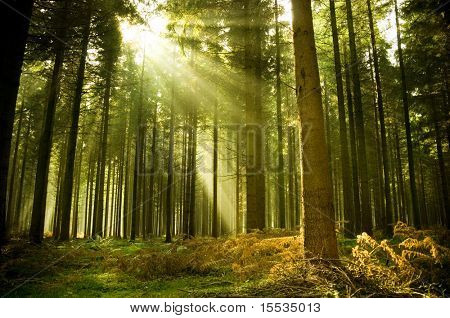 Pine forest with the last of the sun shining through the trees.