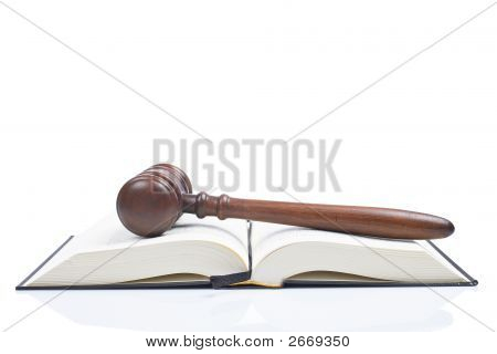 Wooden gavel from the court over the opened law book reflected on white background with space for text. Shallow DOF