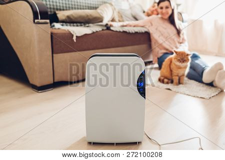 Dehumidifier with touch panel, humidity indicator, uv lamp, air ionizer, water container works at home. Dampness