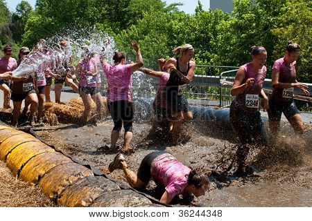 Atlanta, GA - April 2012: A group of unidentified women competing in the Dirty Girl Mud Run splash through the mud pit and get drenched with a fire hose as they near the finish line of the women only obstacle course race in Atlanta, GA on April 28, 2012.