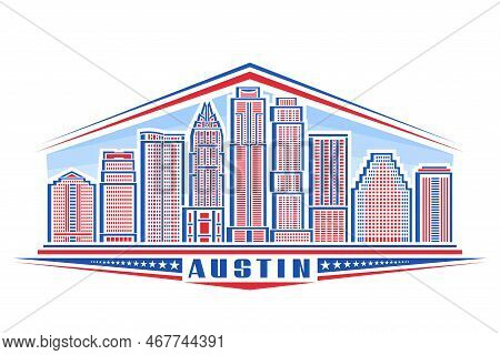 Vector illustration of Austin, horizontal badge with simple linear design famous austin city scape on day sky background, red urban line art concept with decorative lettering for blue text austin