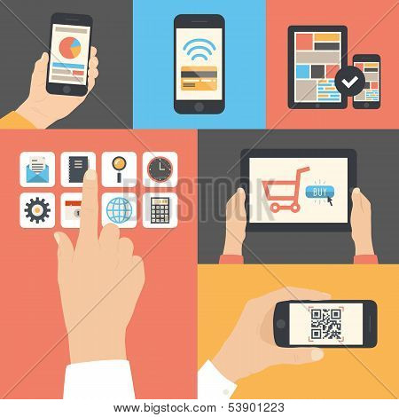 Flat design modern vector illustration icons in stylish colors of hand touch screen with business icons apple iphone scanning qr-code online purchase on apple ipad and wireless e-commerce usage.